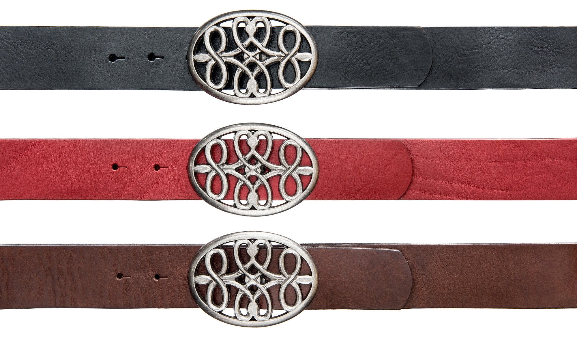 The Infinity Loop belt features an oval buckle in antique nickel on a supple full grain leather strap. Easily switch your buckles for casual to dress looks.